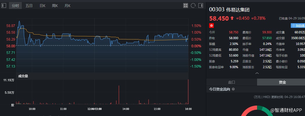 截至今日收盘,伟易达集团(00303)涨0.78%,报58.45港元。