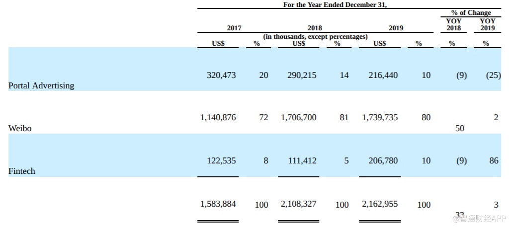 新浪2019年总净营收增至21.63亿美元,同比增长3%,2018年为21.083亿美元。净营收的增长主要是来自于金融科技服务部门营收的增长。2019年金融科技服务净营收约为2.07亿美元,占总净营收的10%,同比增长高达86%,而上一年约为1.11亿美元。来自新浪微博的净营收约为17.4亿美元,占总净营收的80%,同比增长2%。