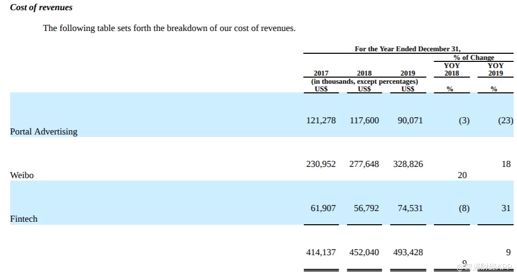 新浪的收入成本在近年来不断上涨,2019年为4.934亿美元,同比增长9%,而2018年为4.52亿美元,2017年为4.141亿美元。成本上涨主要来自于金融科技服务,2019年收入成本约为7500万,同比上涨31%。