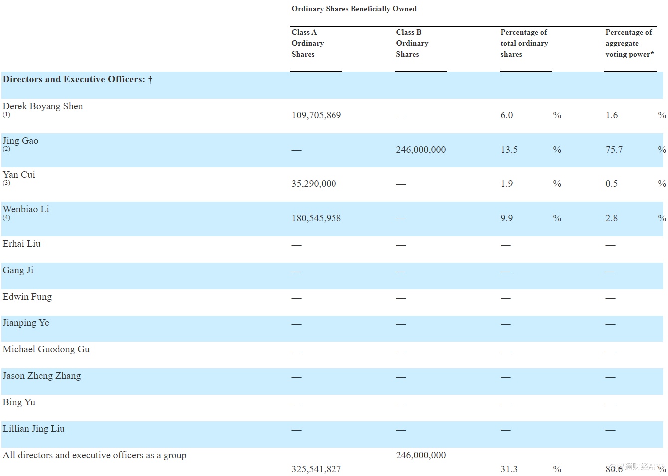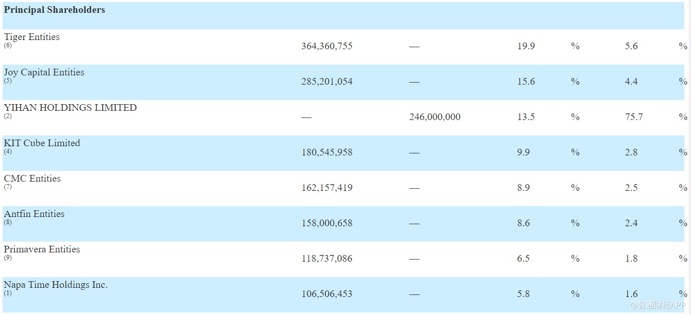 CMC持股为8.9%,拥有2.5%的投票权;蚂蚁金服持股为8.6%,拥有2.4%的投票权;Primavera Entities持股6.5%,拥有1.8%的投票权;Napa Time Holdings Inc.持股5.8%,拥有1.6%的投票权。