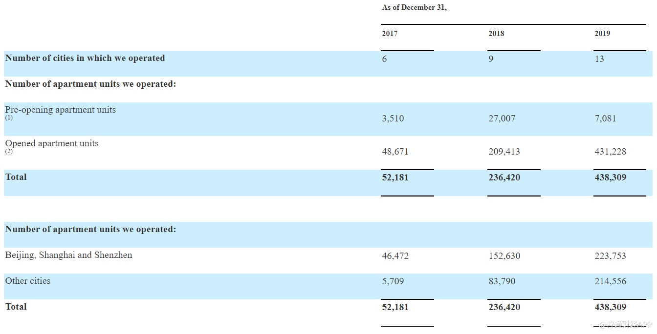 截至2019年12月31日,蛋壳公寓在13个城市建立了业务。运营的公寓数量从2015年12月31日的2,434套增长到2019年12月31日的438,309套,不到四年的时间里增长了180倍。其中,在北京、上海和深圳的公寓数量约22.4万间,同比增长46.6%。其他城市的公寓数量近21.5万间,同比增长156.1%。