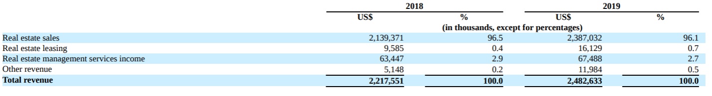 下表显示,来自住宅房地产销售的营收在2019年为23.87亿美元。自住宅房地产出租的营收为1600万美元,占总营收的0.7%。来自物业管理的营收为6749万美元,占总营收的2.7%。其他营收为1198万美元,占总营收的0.5%。