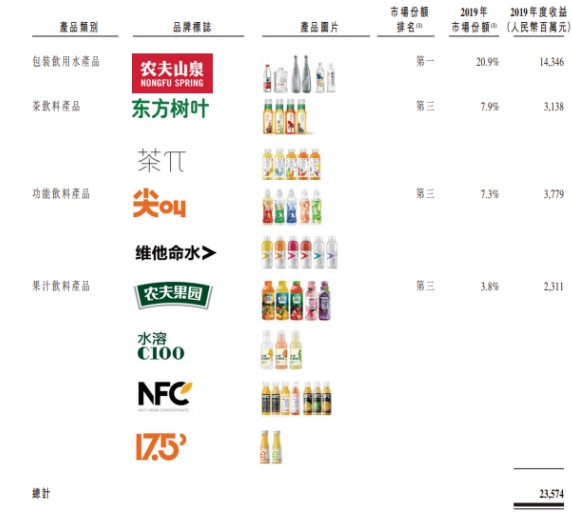 下表显示了农夫山泉各主要类别产品的情况。