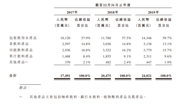 公司于2017年、2018年及2019年,农夫山泉的收益分别为人民币174.91亿元、人民币204.75亿元及人民币240.21亿元;其中包装饮用水产品于2019年占总收益的百分比升至59.7%,远高于其他四类产品。