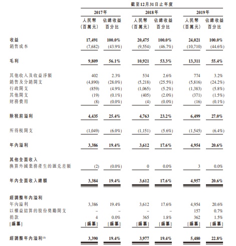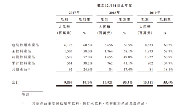 下表显示了所示期间按产品类别划分的毛利明细及毛利率,数据显示,2019年,包装饮用水产品、茶饮料产品和功能饮料产品毛利率超过50%,分别达60.2%、59.7%和50.9%。