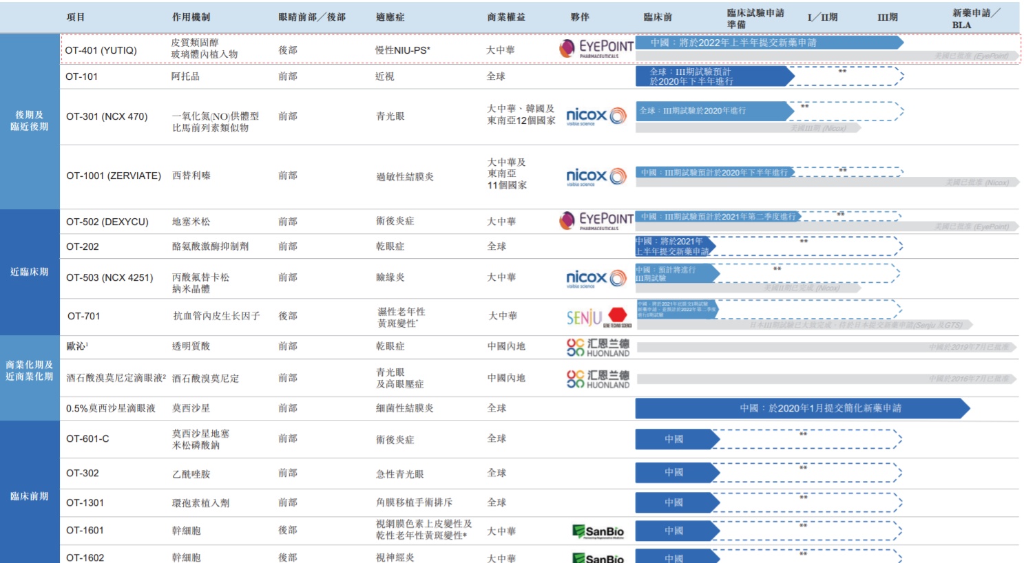 公司在不到三年的时间内,已建立于战略层面精心设计的全面、创新及经过验证的眼科药物组合。根据弗若斯特沙利文的资料,截至最后实际可行日期,公司组合中有16种药物资产,涵盖所有主要的眼睛前部及后部疾病,使其成为中国仅有的几家拥有全面覆盖范围的医药公司之一。