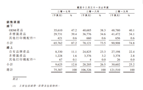 截至二零一七年、二零一八年及二零一九年十二月三十一日止年度,线下渠道收益分别占总收益约87.2%、73.5%及74.8%,其中ODM产品和非标签产品2019年收益占总收益比例分别为40.1%和34.1%;线上销售平台收益分别占总收益约12.8%、26.5%及25.2%,其中自有品牌产品收益占比较高,达22.4%。