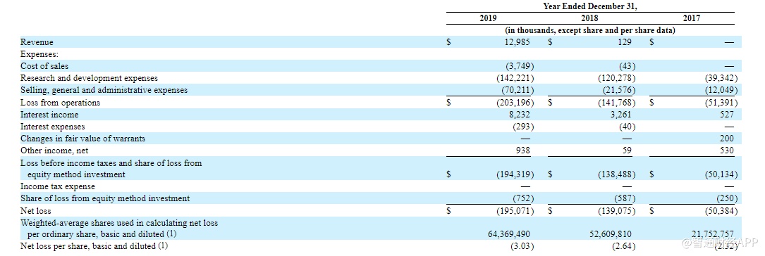 年报显示,再鼎医药2019年营收为1298.5万美元,2018年为12.9万美元。2019年,归属于普通股股东的净亏损为1.95亿美元,同比增加约40.3%,2018年和2017年净亏损分别为1.39亿美元和5038.4万美元。2019、2018和2017年,基础和稀释后每股分别亏损3.03、2.64和2.32美元。