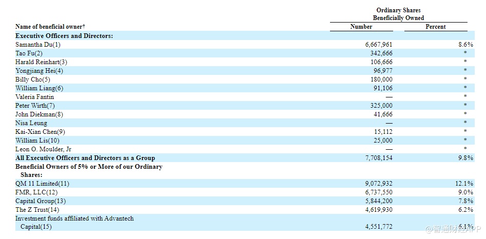 第三大股东为杜莹,其为公司创始人、董事长兼首席执行官,持有6,667,961股普通股,占比8.6%。
