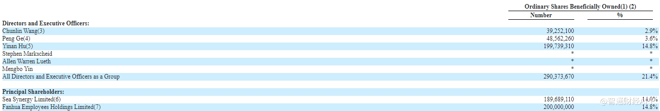 联合创始人兼董事胡义南持股数为199,739,310,占比14.8%。其持股包括(i)胡义南直接持有的10,041,200股ADS,和(ii)Sea Synergy Limited直接持有的189,698,110股普通股。Sea Synergy由一个家庭信托100%持有,其中胡义南是委托人和共同受益人,且可被视为实益拥有Sea Synergy持有的泛华金控的所有普通股。