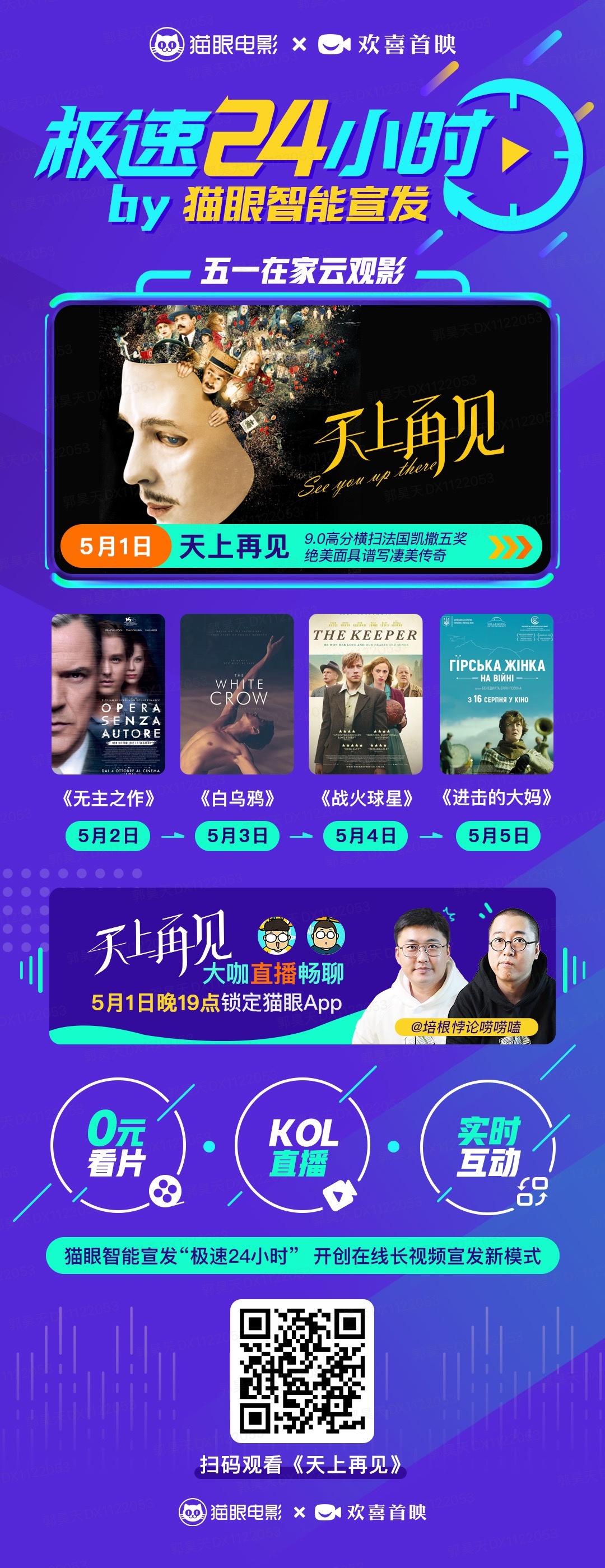今日19点,猫眼智能宣发——“极速24小时”新产品的首部影片《天上再见》将与用户见面。该影片为欢喜首映VIP独播佳作,但本次合作中,用户可以在猫眼APP等多渠道中免费观看。电影《天上再见》曾获第43届法国凯撒电影奖最佳导演奖、最佳改编剧本、最佳摄影等五项大奖,是法国男星亚伯杜庞蒂自导自演影片,改编自同名犯罪小说。该影片在烂番茄指数94%,豆瓣评分8.1分,欢喜首映APP推荐指数8.5,猫眼口碑9分,在资深影迷圈中热度和好评颇高。