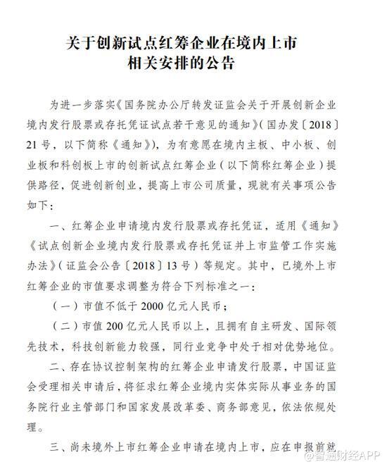 智通财经APP获悉,周四,经国务院批准,中国证监会公布《关于创新试点红筹企业在境内上市相关安排的公告》,自公布之日起施行。