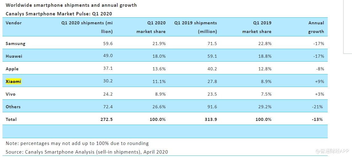 5月1日,全球权威调研机构Canalys发布全球智能手机市场Q1季报。受公共卫生事件影响,全球智能手机出货量同比下滑13%至2.72亿部。小米智能手机市场份额持续稳居全球第四,同时逆势增长9%,在主要手机厂商中增幅最高。
