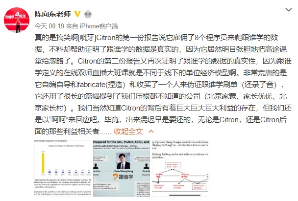 同时,跟谁学创始人、董事长兼CEO陈向东也在个人微博回应称,真的是搞笑,跟谁学知道Citron的背后有着巨大巨大巨大利益的存在,但还是以“呵呵”来回应吧。