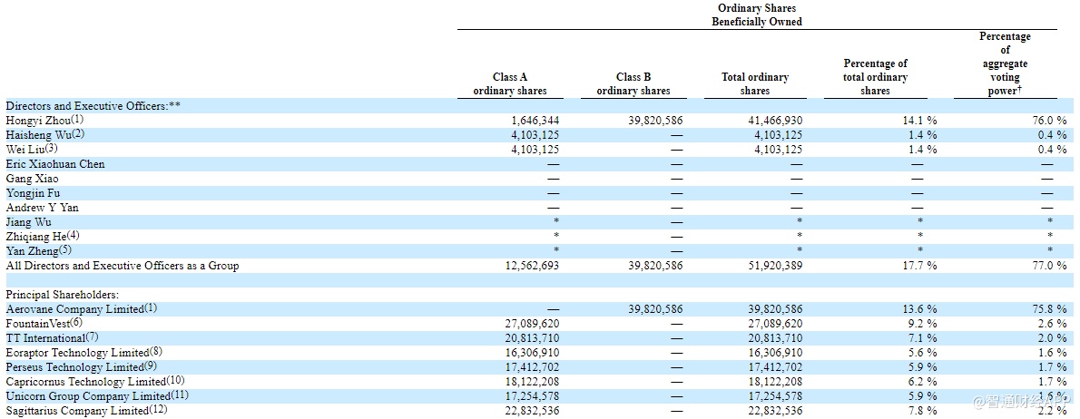 Eoraptor Technology Limited持股占比为5.6%,拥有1.6%的投票权;Perseus Technology Limited持股占比为5.9%,拥有1.7%的投票权;Capricornus Technology Limited持股占比为6.2%,拥有1.7%的投票权;Unicorn Group Company Limited持股占比为5.9%,拥有1.6%的投票权;Sagittarius Company Limited持股占比为7.8%,拥有2.2%的投票权。