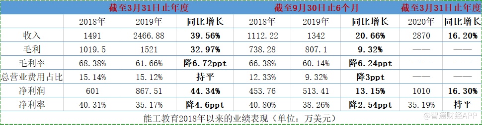 不过,能工教育的业绩表现却差强人意。智通财经APP发现,2020财年时(截至2019年9月30日止6个月),能工教育的收入、净利润增速均有明显下滑。