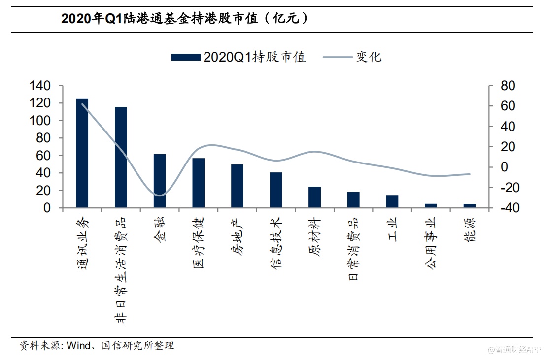 据国信证券,2020年一季度陆港通基金持港股总市值为516亿元,去年四季度为419亿元,环比上升97亿元。其中通讯业务行业占比最大,非日常生活消费品行业次之,能源行业一季度持股市值最小。