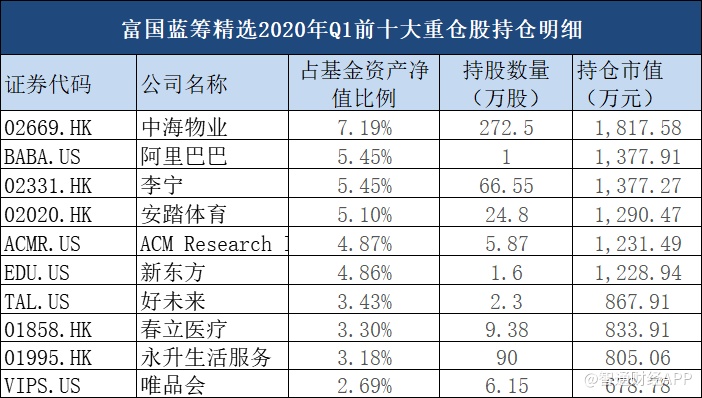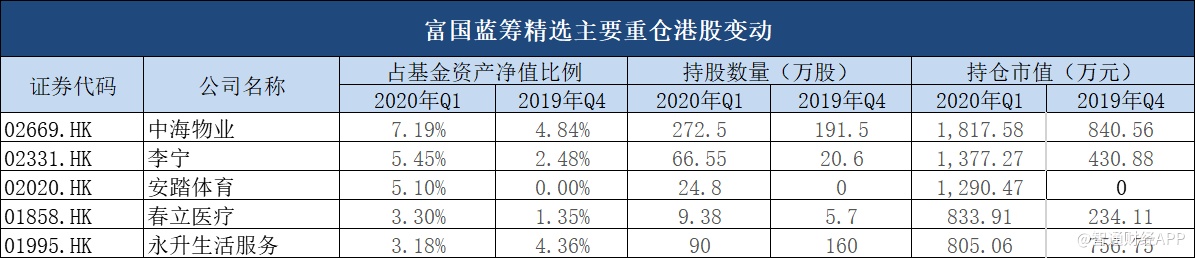 与2019年第四季度相比,其重仓股发生明显变化,上海复旦(01385)、方达控股(01521)、康龙化成(03759)均已不在前十大重仓股之列,说明一季度富国蓝筹精选对这些个股进行了减持或清仓。