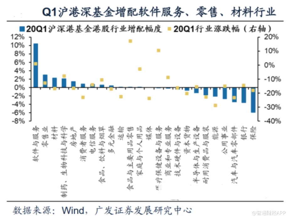 整体而言,据广发证券统计,从一季度行业持仓占比变化看,2020年Q1沪港深基金大幅加仓软件服务行业,小幅加仓零售、材料、医药等行业,同时大幅减持保险、银行等金融板块个股。