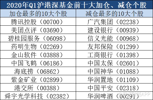 个股层面,前三大加仓个股分别为腾讯控股(00700)、美团点评(03690)、碧桂园服务(06098),减仓幅度较大的个股包括广汽集团(02238)、建设银行(00939)、信义光能(00968)等。