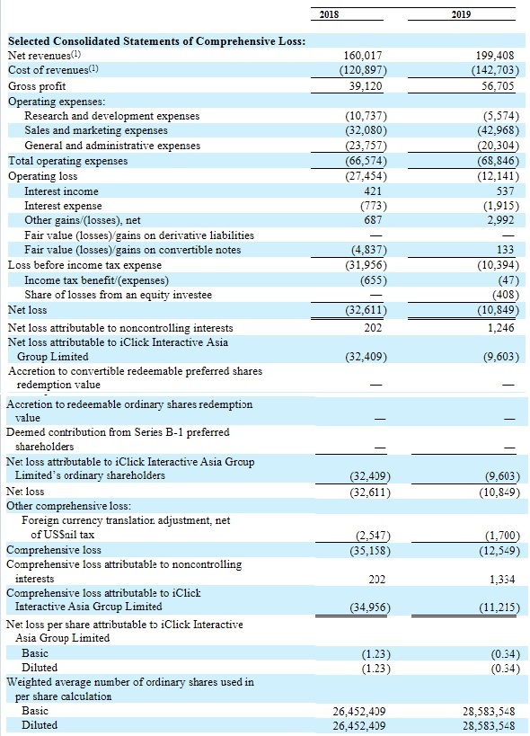 智通财经APP获悉,据爱点击(ICLK.US)近日披露的2019财年全年年报文件(20-F)显示,公司全年总营收为1.99亿美元,去年同期为1.60亿美元,同比增长24.6%;毛利5670.5万美元,去年同期为3912.0万美元,同比增长45%。净亏损为1084.9万美元,去年同期为亏损3261.1万美元,亏损大幅缩窄。