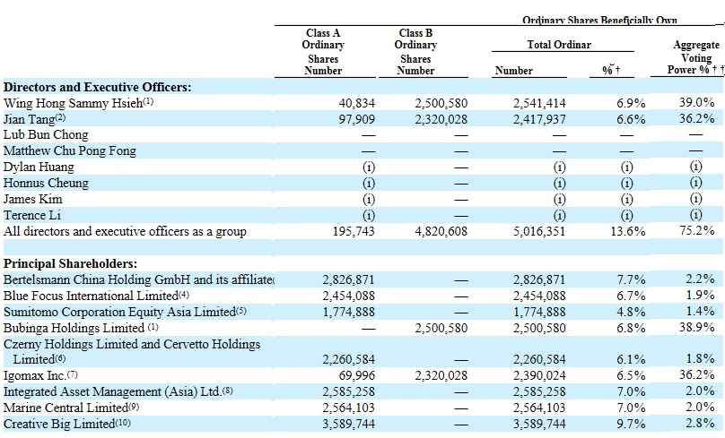 股权方面,截至2019年12月31日,董事会主席薛永康(Wing Hong Sammy Hsieh)名下折合普通股总数为2,541,414股,持股占比6.9%,投票权占比39.0%。管理层整体持股比例为13.6%,投票权占比75.2%。管理层持股及主要股东情况详细见下表: