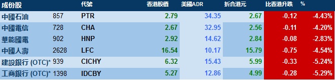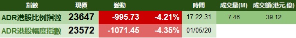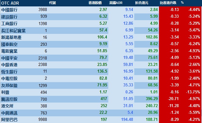 智通财经APP获悉,周五,美股三大股指均跌超2%,港股ADR受压,按比例计算,收报23647点,跌995.73点或4.21%。