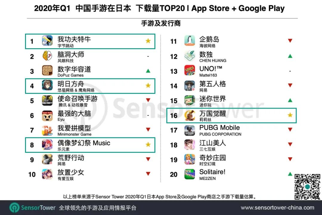 其中由鹰角网络制作,悠星网络发行的二次元手游《明日方舟》在Q1成功空降榜单第16名,是本期日本榜单上唯一的新游,与本土漫改IP大作比肩。