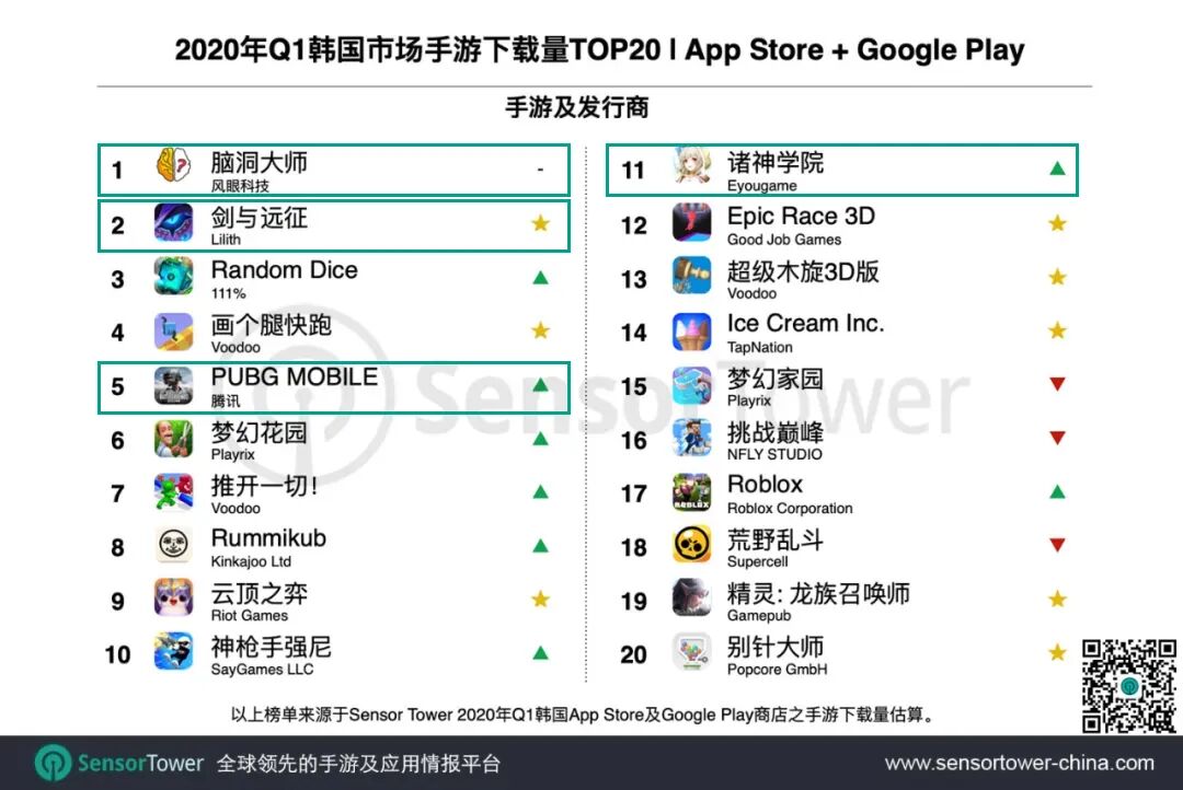 而在Q1韩国市场的下载榜方面,风眼科技旗下的《脑洞大师》成功蝉联本季度下载榜冠军,而在2月初登陆韩国市场的莉莉丝《剑与远征》跻身榜单第2名 ,榜单前两位均被中国厂商成功拿下。