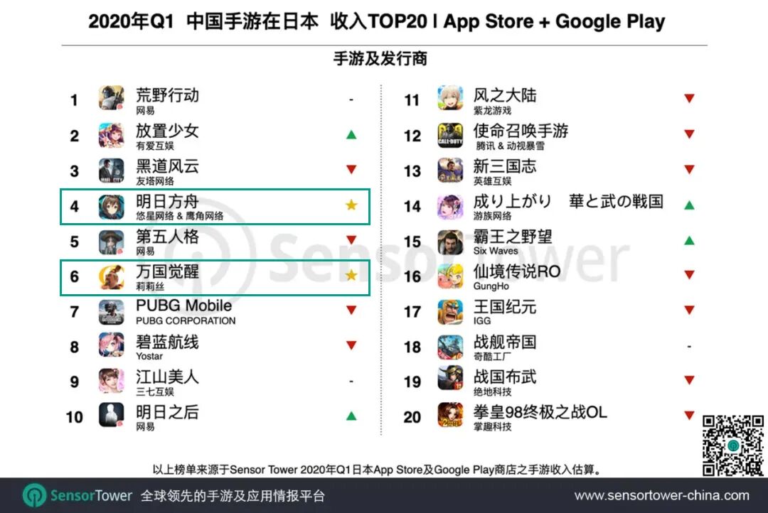 而具体到中国手游在日本市场的第一梯队产品方面,在Q1收入TOP20的产品名单中,仅有2款新游成功入围,分别是《明日方舟》和《万国觉醒》。