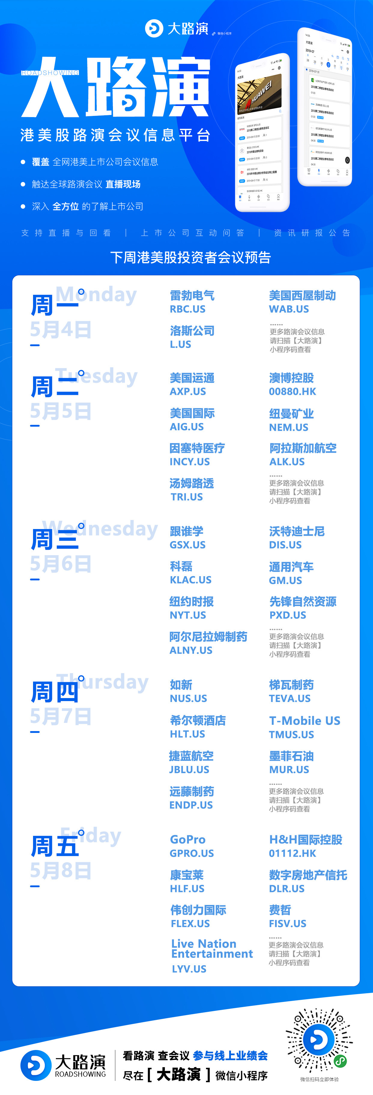 以下是智通财经“大路演”为您整理的下周(5月4日-5月8日)港美股上市公司会议日历。