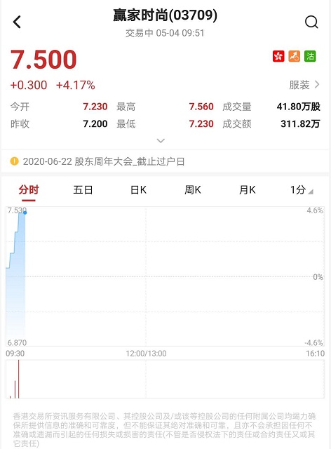 智通财经APP获悉,赢家时尚(03709)大股东将3.03%股份注入股份奖励计划,消息助力股价逆市上扬,截至9时51分,涨4.17%,报价7.5港元,成交额311.82万。