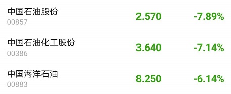 智通财经APP获悉,一季报表现不佳,“三桶油”早盘集体下挫,中石油(00857)暂领跌蓝筹,截至10时46分,中石油(00857)跌7.89%,报价2.57港元,中石化(00386)跌7.14%,中海油(00883)跌6.14%。