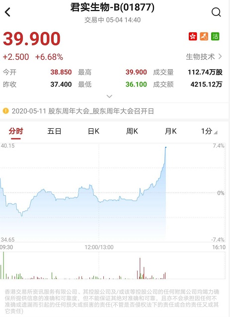 智通财经APP获悉,君实生物-B(01877)早间发布公告称,与礼来制药签署研发合作和许可协议。该股午后快速拉升,截至14时40分,涨6.68%,报价39.9港元,成交额4215.12万。