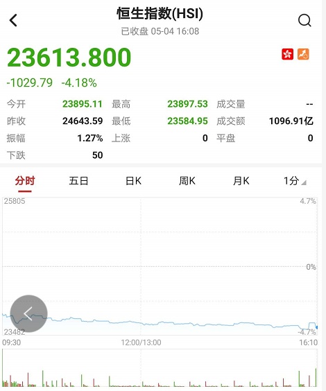 智通财经APP获悉,恒指今日低开低走,早盘曾低开跌748.48点或3.04%,报23895.11点。截至收盘,恒生指数跌1029.79点或4.18%,报23613.8点,全日成交额达1096.91亿。国企指数跌4.4%,报9599.02点,红筹指数跌4.08%,报3706.12点。