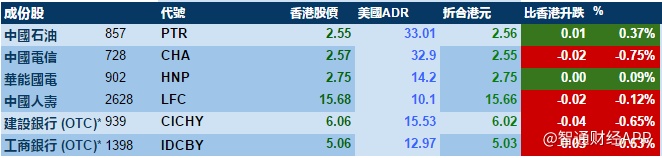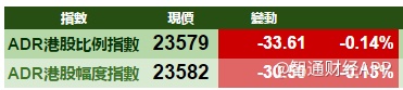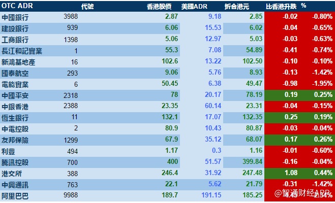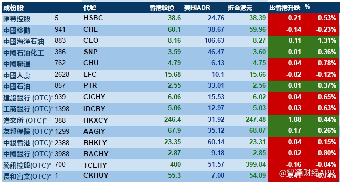 智通财经APP获悉,美股先跌后回稳,港股ADR指数全日微跌,按比例计算,收报23579点,跌33.61点。大型蓝筹微跌,汇丰控股收报38.39元,较港收市跌0.21元;腾讯控股收报399.84元,较港收市跌0.16元。