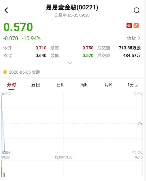 智通财经APP获悉,易易壹金融(00221)获邓清河溢价44.4%提私有化,今日复牌,早盘高开低走,振幅达30%,截至9时38分,跌10.94%,报价0.57港元,成交额484.57万。
