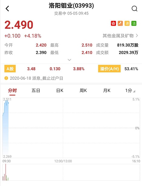 智通财经APP获悉,洛阳钼业(03993)获野村上调评级至“买入”,维持目标价3.3港元。截至9时45分,涨4.18%,报价2.49港元,成交额2029.39万。