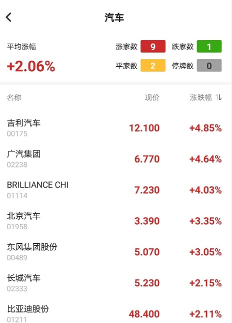 智通财经APP获悉,汽车股早盘集体反弹,吉利汽车(00175)升逾4%暂领涨蓝筹,截至10时01分,吉利汽车(00175)涨4.85%,报价12.1港元,广汽集团(02238)涨4.64%,北京汽车(01958)涨3.35%,长城汽车(02333)涨2.15%,比亚迪股份(01211)涨2.11%。