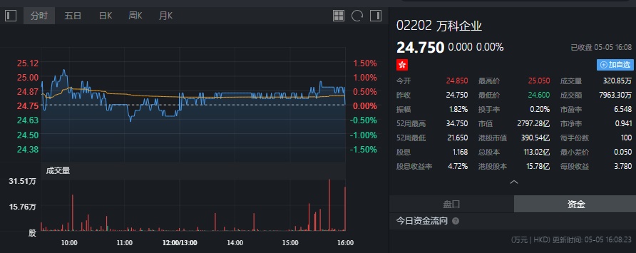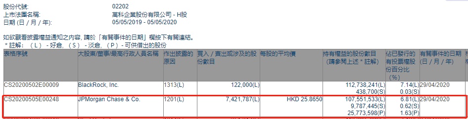 智通财经APP获悉,联交所最新资料显示,4月29日,摩根大通减持万科企业(02202)742.1787万股,每股作价25.865港元,总金额约为1.92亿港元。减持后最新持股数目约为1.08亿股,最新持股比例为6.81%。