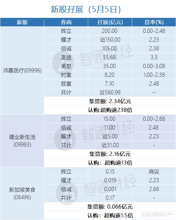 智通财经APP获悉,沛嘉医疗(09996)、建业新生活(09983)、新加坡美食(08496)正在招股中,截至5月5日,辉立、耀才、信诚等券商分别为其借出560.98亿港元、31亿港元和0.17亿港元,其中沛嘉医疗超购逾238倍。