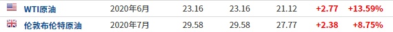 因多国逐渐解除封锁,产油国实施新一轮减产,导致原油期货大涨。截至发稿,WTI原油涨13.59%,报23.16美元/桶。布伦特原油涨8.75%,报29.58美元/桶。
