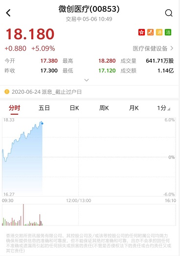 智通财经APP获悉,微创医疗(00853)近日发布公告,附属公司与Robocath订立协议,进行最多4000万欧元的战略性投资,并成立合营企业。据悉,Robocath从事设计、开发及商业化用于治疗血管疾病的机器人解决方案。该利好持续发酵,微创医疗今日继续上涨,截至发稿,涨5.2%,报18.2港元,成交额1.14亿港元。