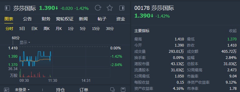 智通财经APP获悉,富瑞发表研究报告,莎莎国际(00178)昨天发表盈警,预计2020年度撇除计提减值拨备亏损达2.6-3亿元,较该行预期的1.24亿多。该行表示维持其“持有”评级,目标价1.89港元。