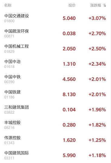 截至发稿,中国交通建设(01800)涨3.07%,报5.04港元;中国中铁(00390)涨2.24%,报4.57港元;中国铁建(01186)涨1.88%,报8.12港元。