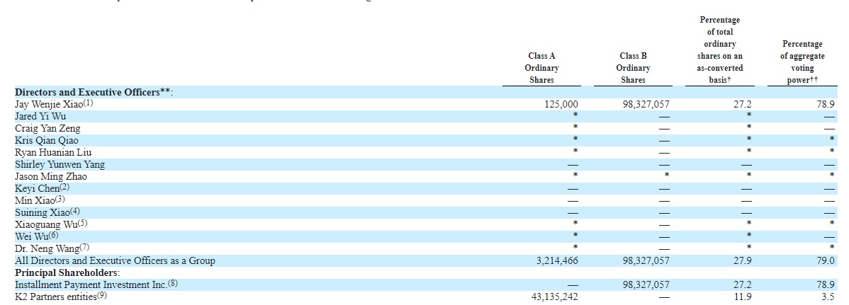 公司第一大股东为创始人兼首席执行官肖文杰,持有125,000股公司A类股,98,327,057股公司B类股,普通股持股比例为27.2%,投票权占比78.9%。