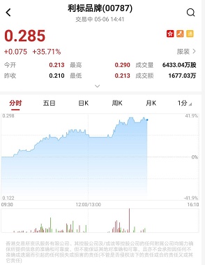 智通财经APP获悉,纺织服饰板块全线反弹,利标品牌(00787)午后涨幅扩大逾35%,暂领涨板块,截至14时41分,涨35.71%,报价0.285港元,成交额1677.03万。
