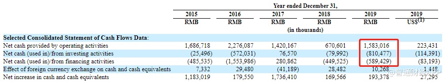 截至2019年12月31日止全年,公司实现经营活动现金流净流入15.83亿元(约合2.23亿美元);投资活动现金流净流出8.1亿元(约合1.14亿美元);筹资活动现金流净流出5.89亿元(约合8319.3万美元)。