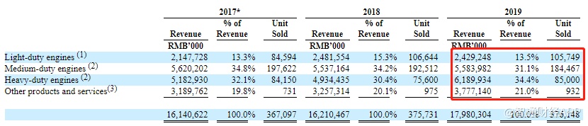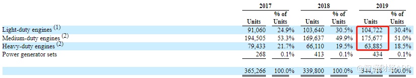 产量上,2019年公司生产轻型发动机104722台,占比30.4%;中型发动机175677台,占比51%;重型发动机63885台,占比18.5%。
