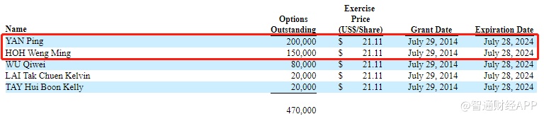 其中,董事会主席晏平拥有200,000股期权,行使价为21.11美元,于2021年7月28日到期;董事会副主席HOH Weng Ming拥有150,000股期权,行使价为21.11美元,于2021年7月28日到期。其它期权持股情况如下: